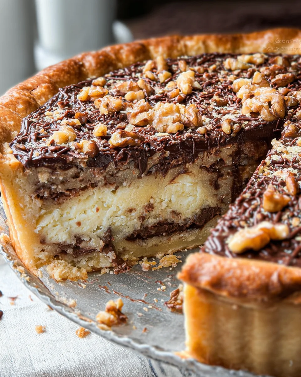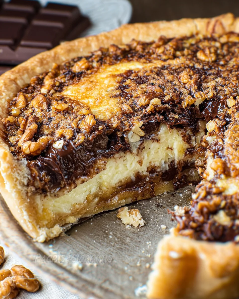 - Spread the cake batter evenly in the chilled pie crust, pour the chocolate layer on top, and sprinkle walnuts before baking.